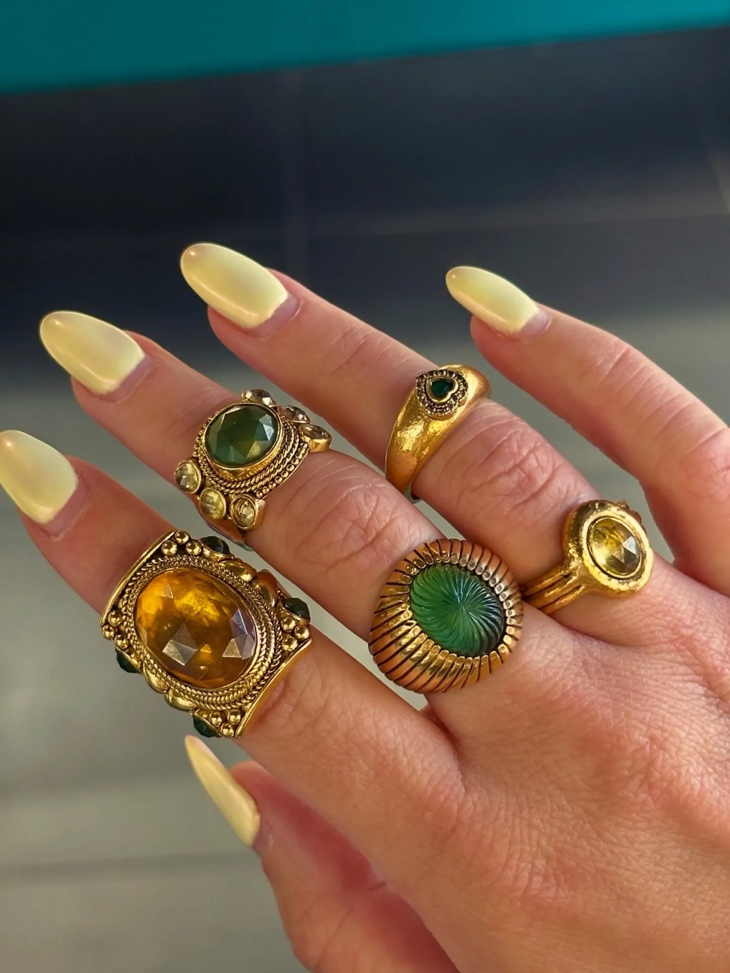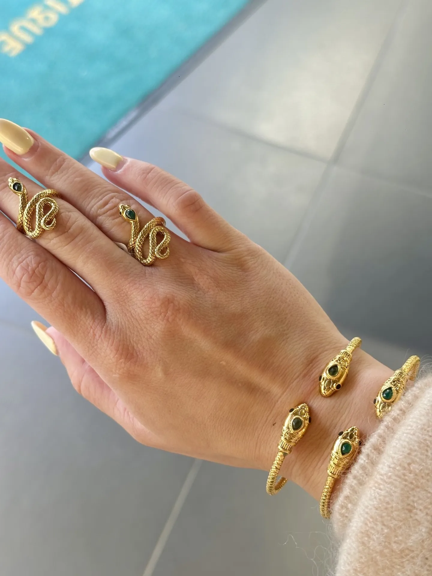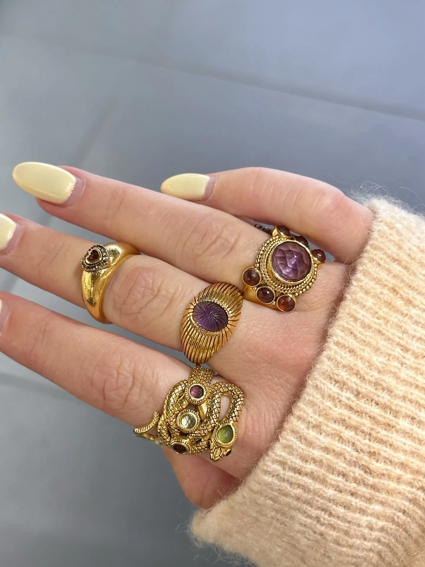 Chaque bague porte en elle une symbolique forte, entre amour, protection et lumière. Les pierres naturelles — Serpentine, Améthyste, Citrine, Grenat, Tourmaline rose ou Agate verte — subliment des montures au design inspiré et audacieux.