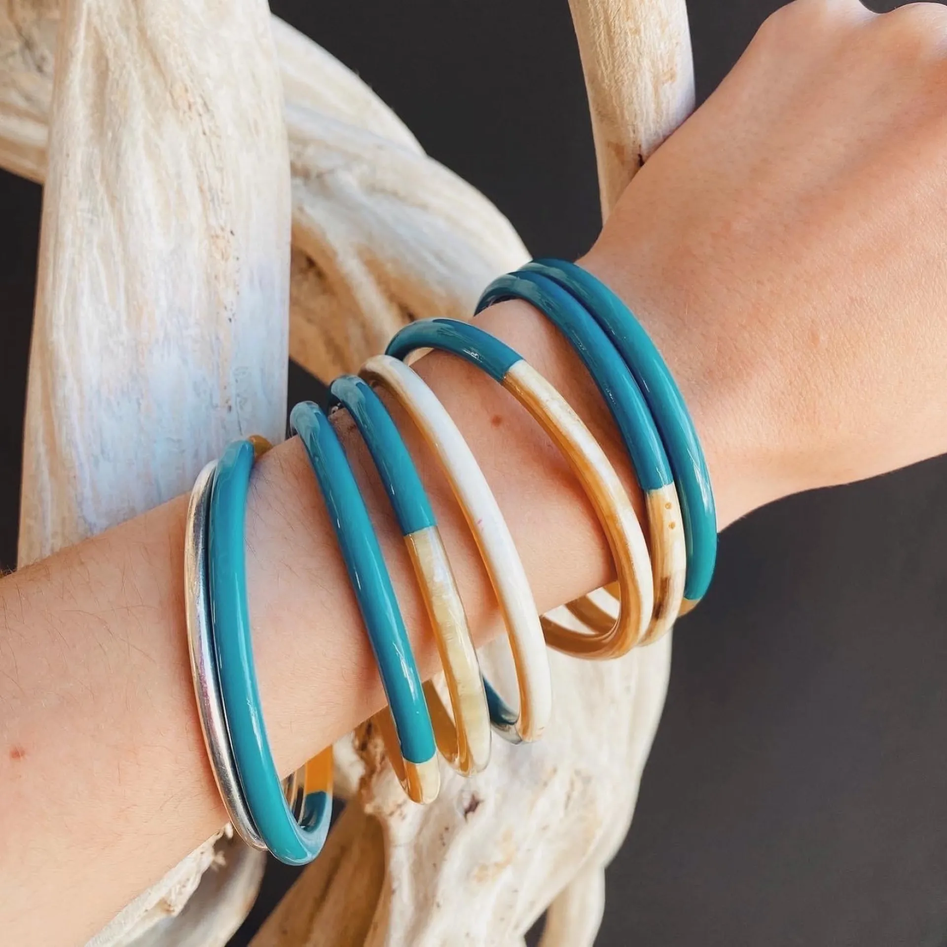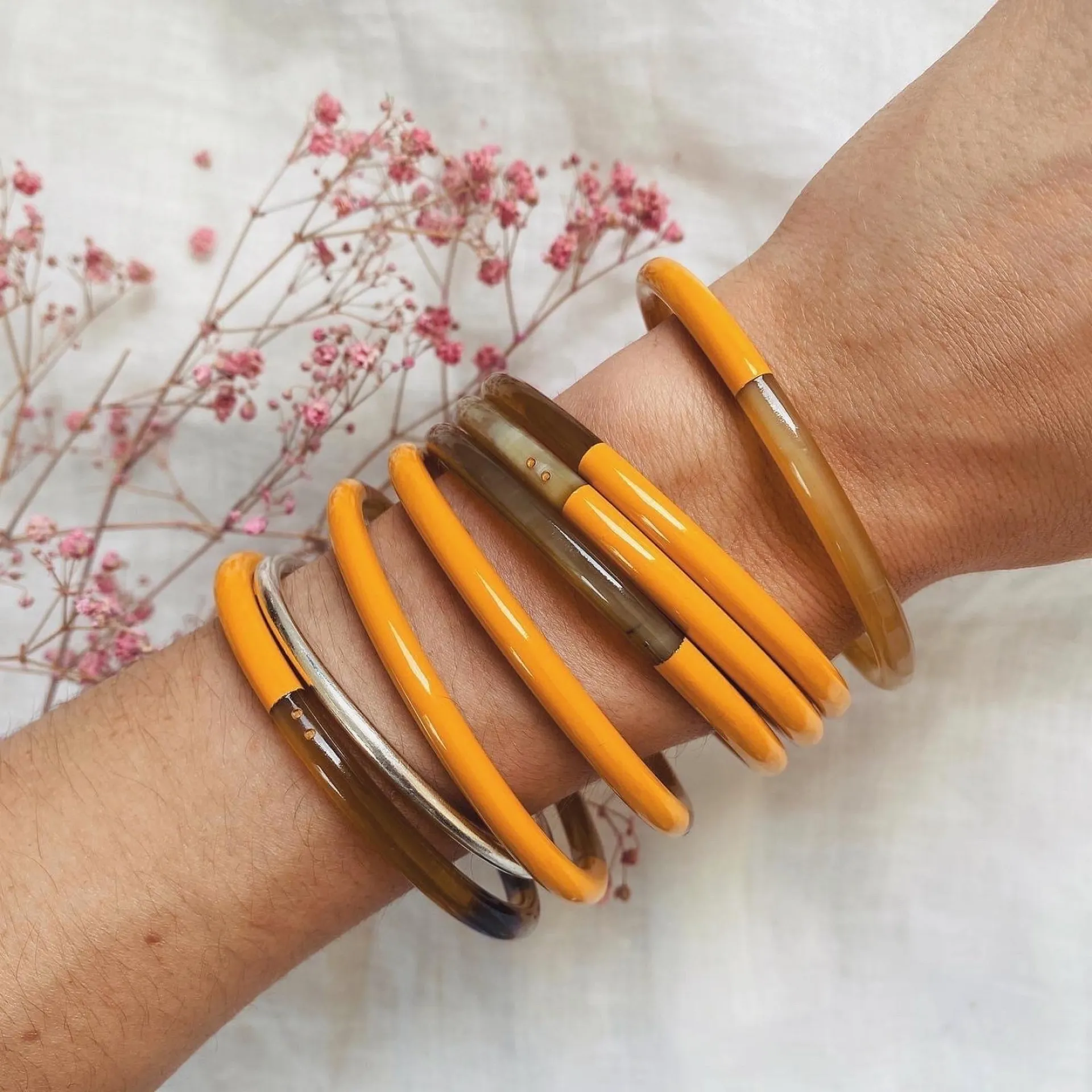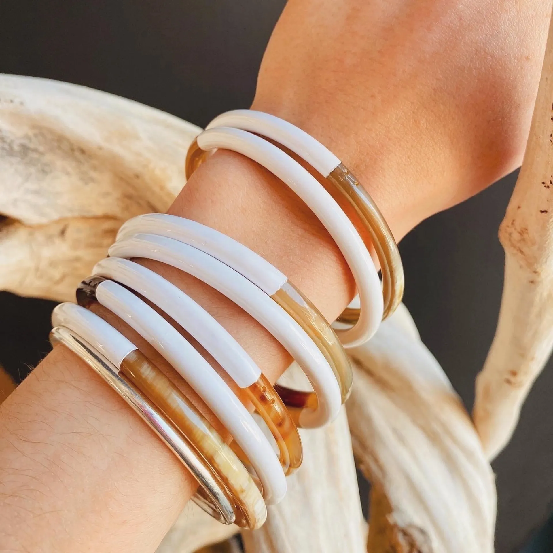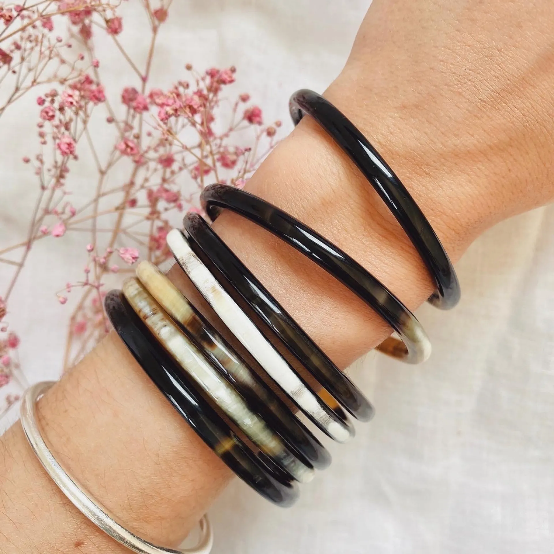 Les bracelets en corne se marient parfaitement avec d'autres pièces de notre sélection (joncs bouddhistes, joncs en résine, etc.).