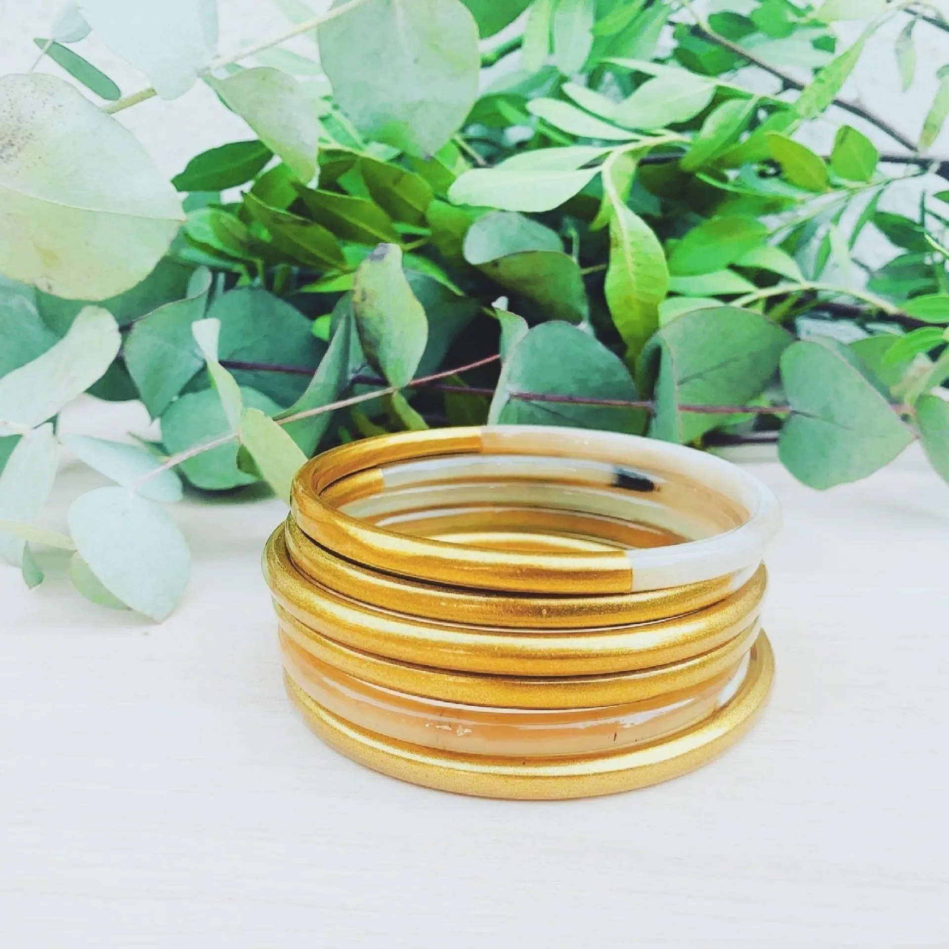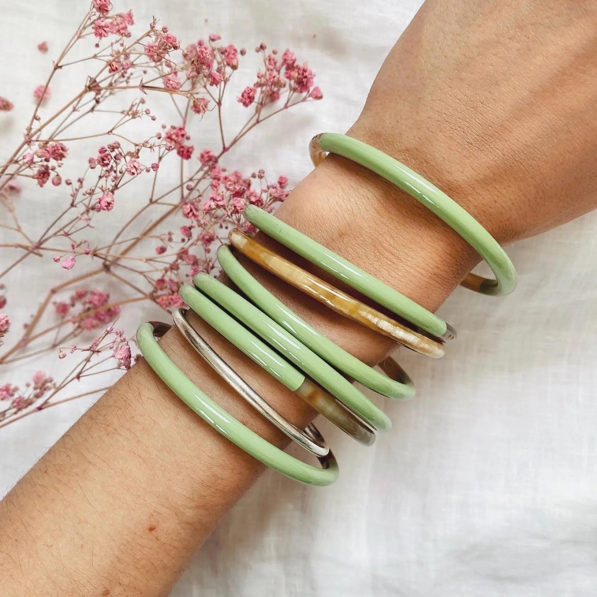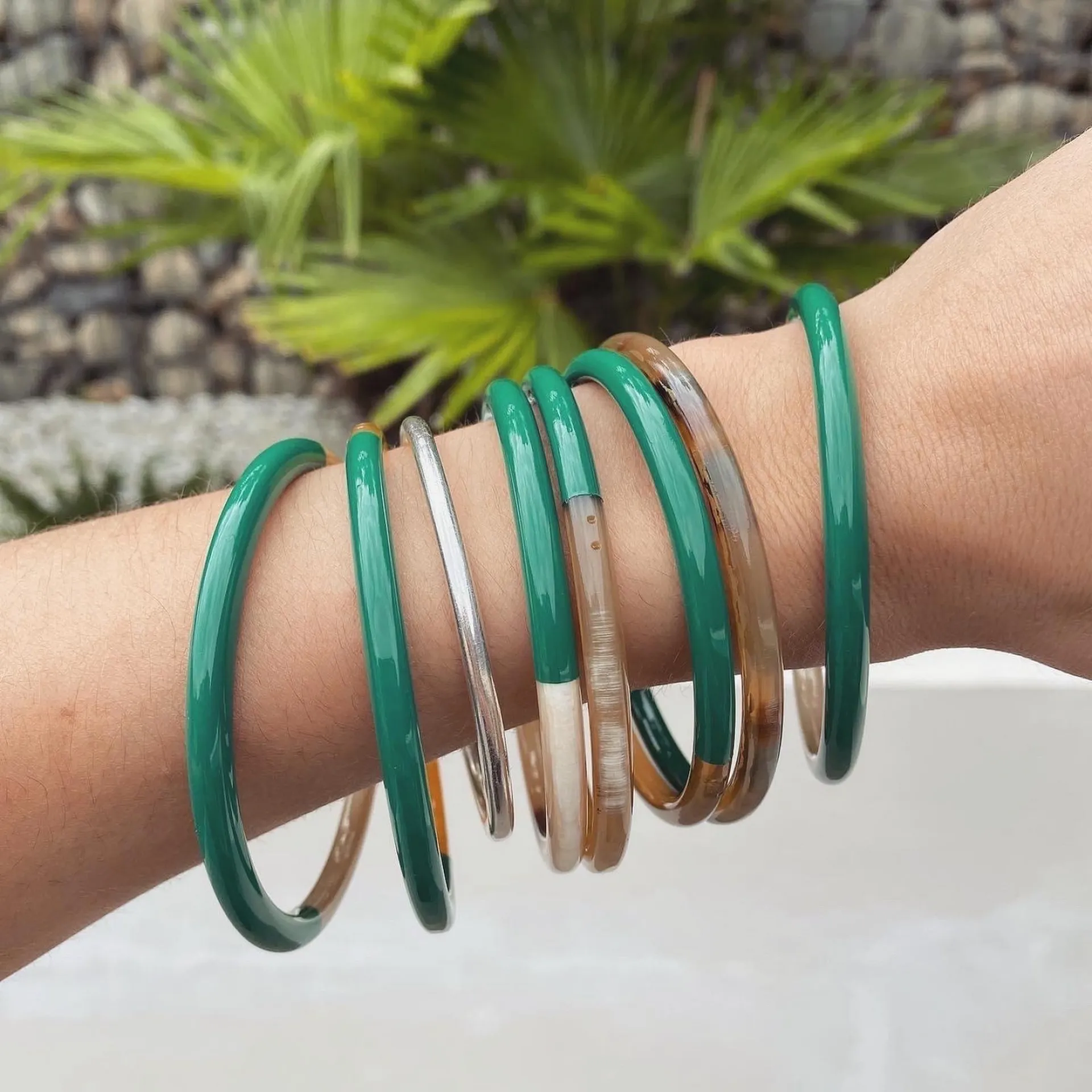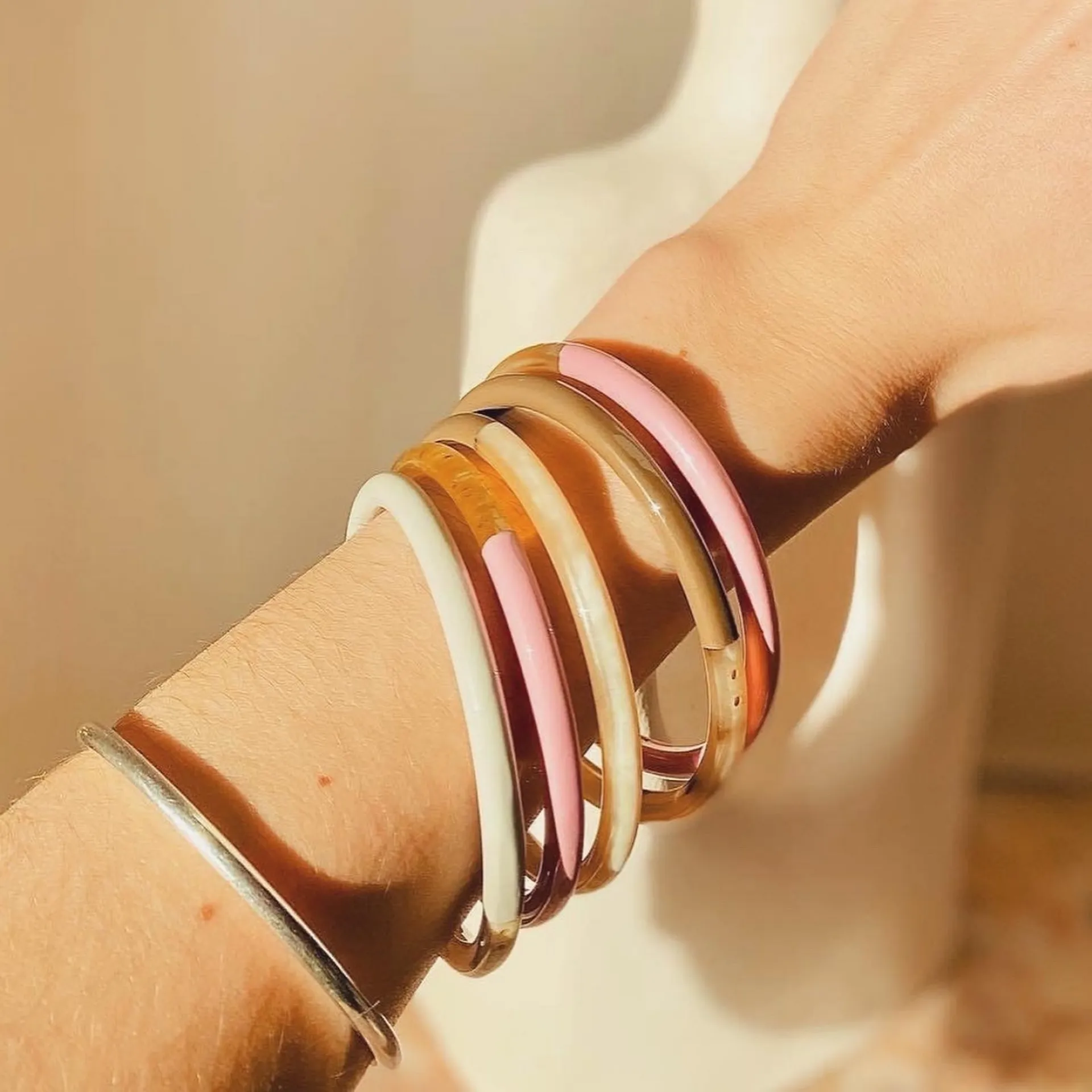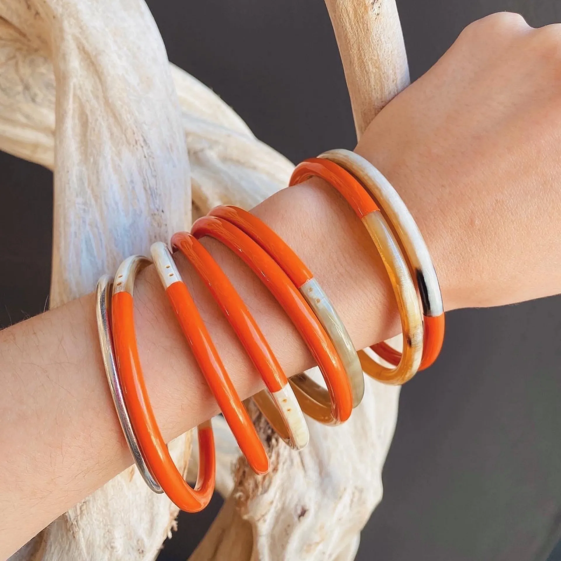 Les bracelets en corne se marient parfaitement avec d'autres pièces de notre sélection (joncs bouddhistes, joncs en résine, etc.).