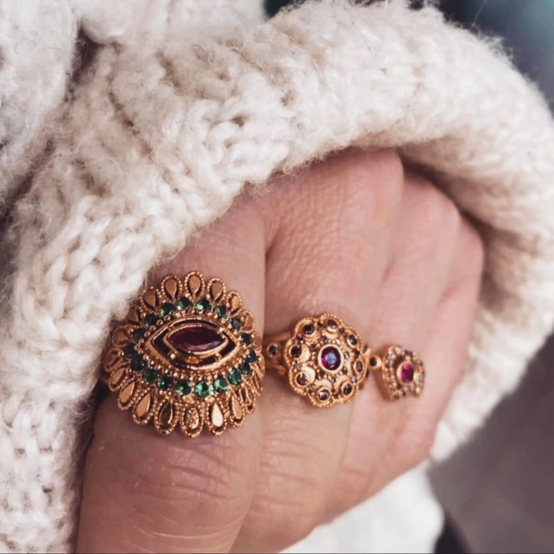 La bague Ayla de Virginie Berman est en plaqué or 18 carats doré mat brossé, sertis de pierres naturelles et de zirconiums de couleur, disponible en plusieurs coloris.