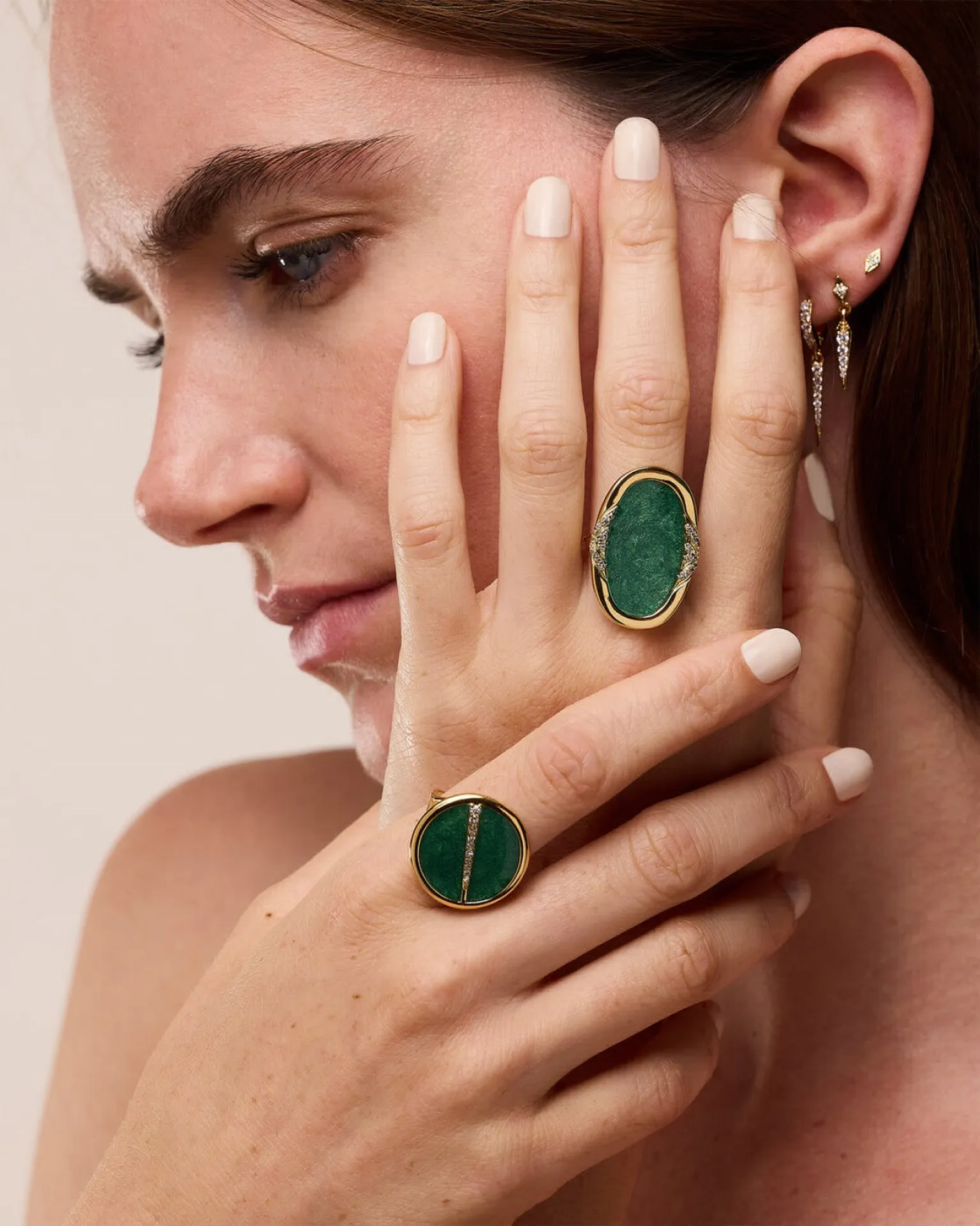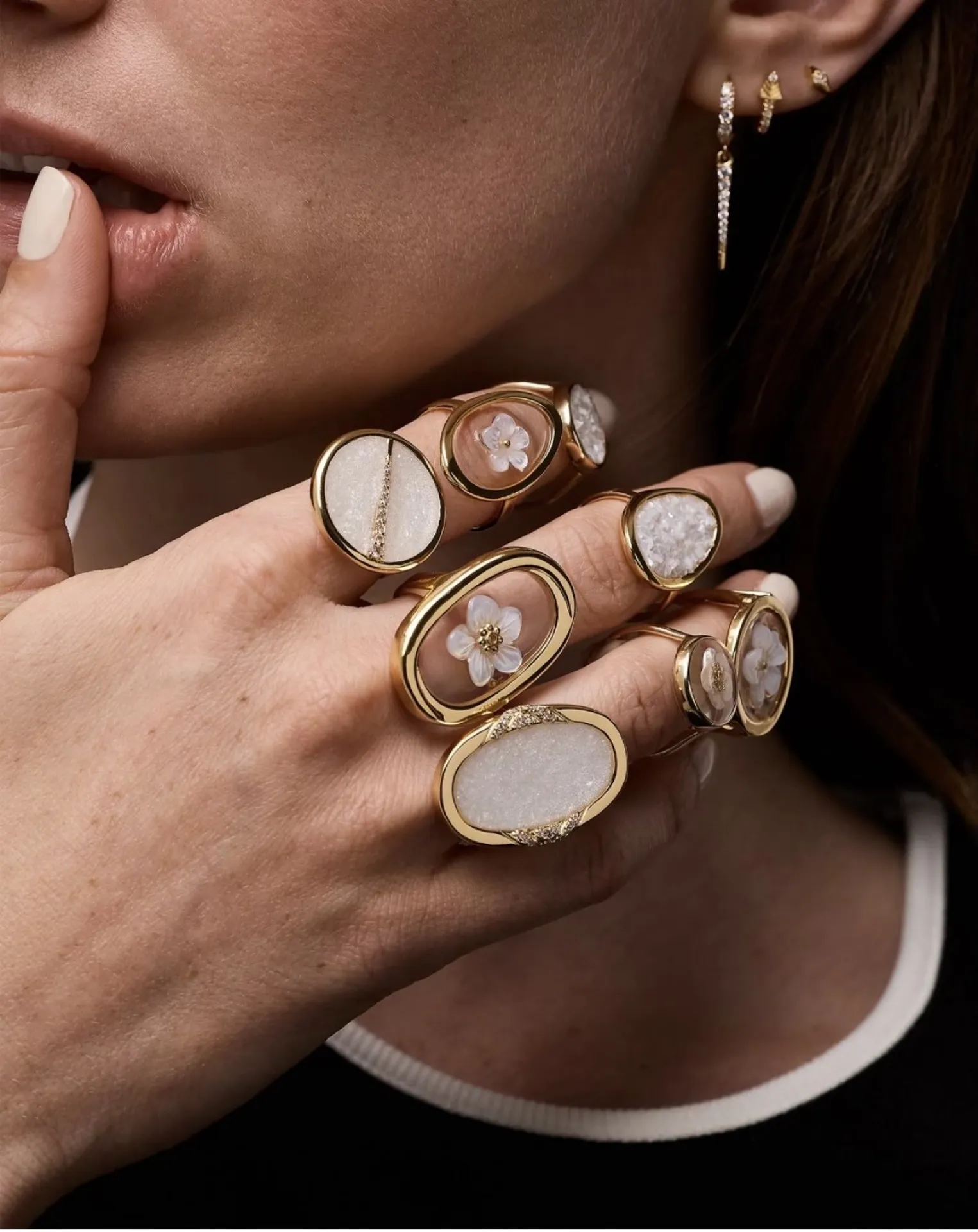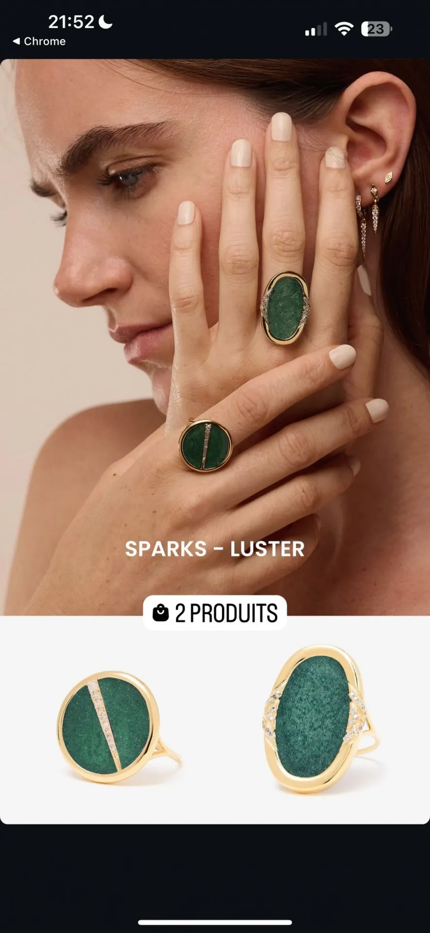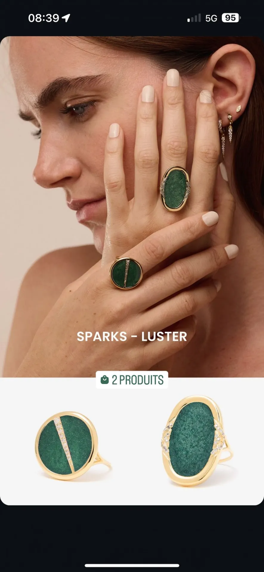 ❄️Nouveautés automne hiver 2024, les bagues rondes et colliers Sparks sont composés de fragments de pierres fines sous résine, avec une petite barrette de zirconium sur plaqué or 18 carats.
