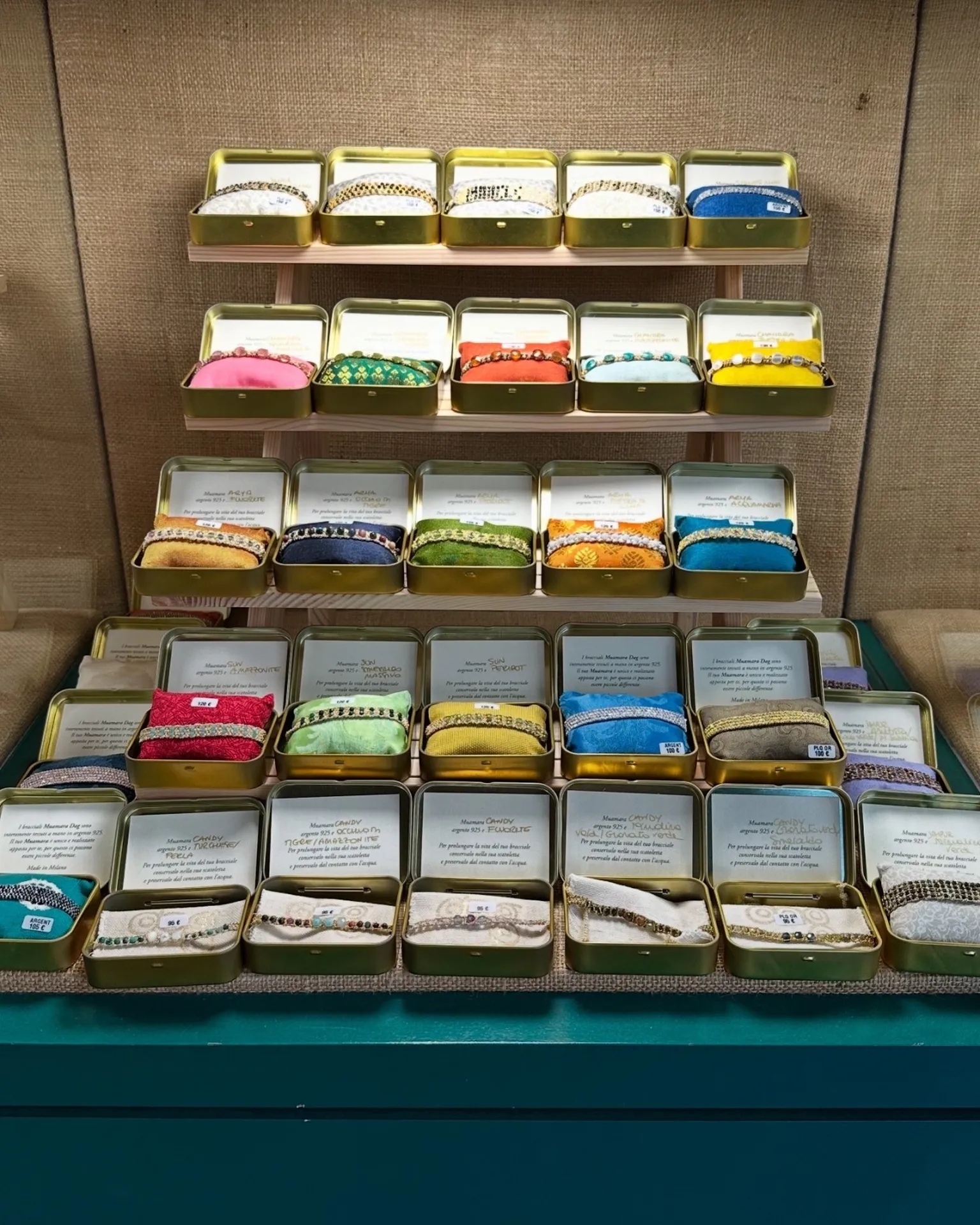 Chaque pièce est présentée dans sa boîte en métal avec la carte descriptive de la créatrice expliquant l’origine et la signification des pierres.