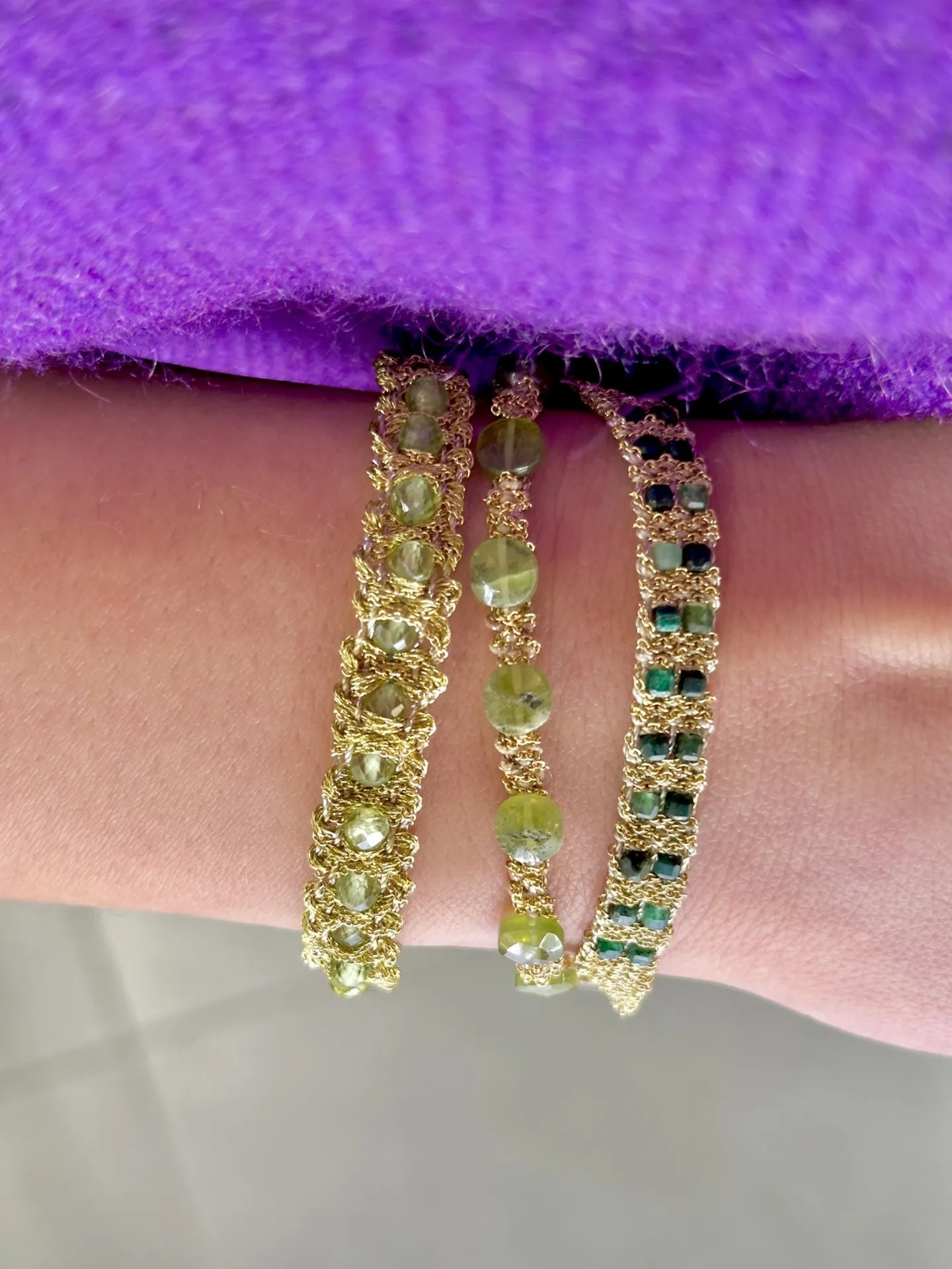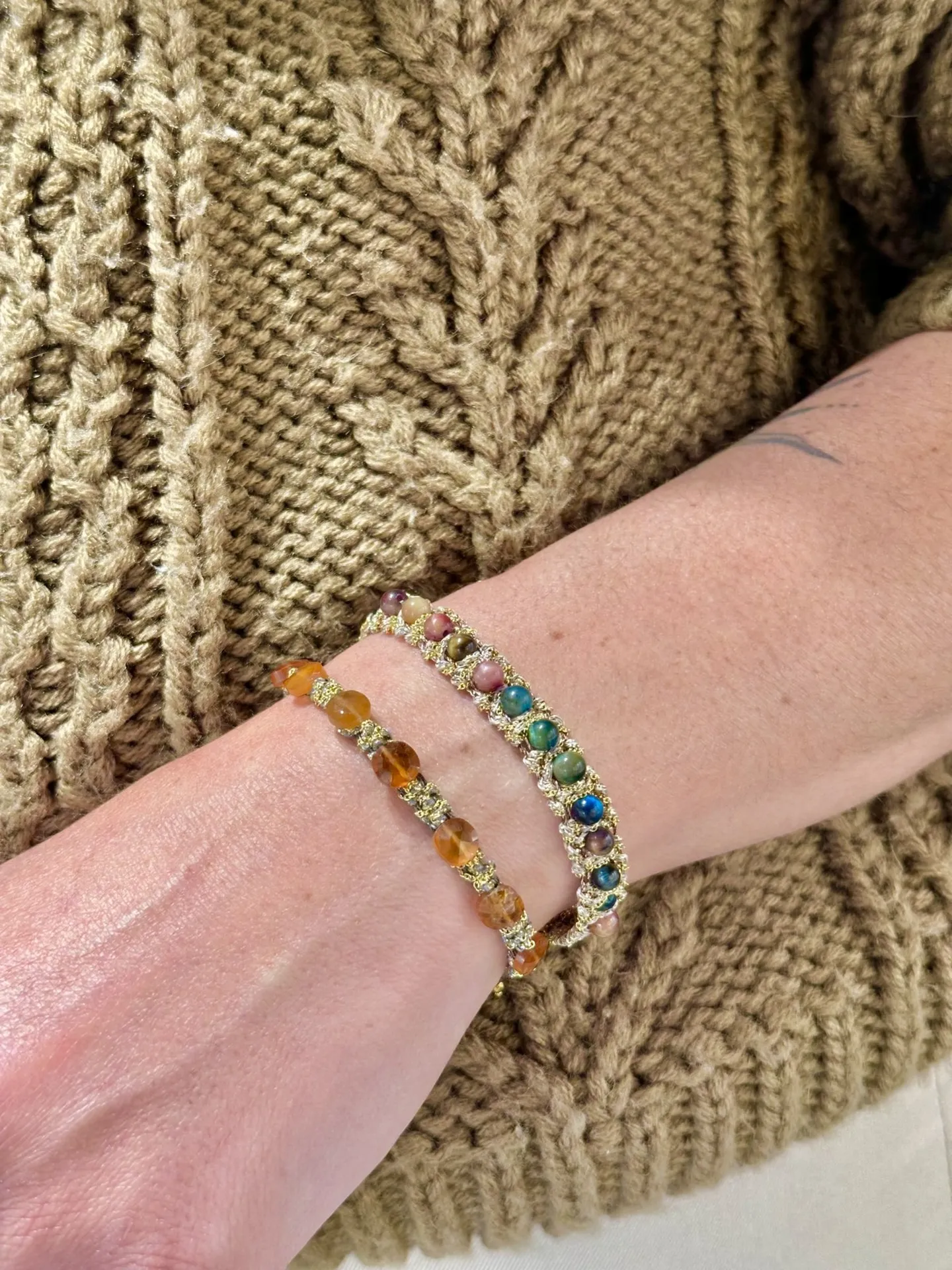 Chaque modèle est unique : façonné à la main par Valentina, créatrice italienne passionnée, il associe des pierres semi-précieuses comme la fluorite, l’aigue-marine, l’amazonite, le quartz, l’œil de tigre, le péridot, la pierre de lune ou encore le grenat.