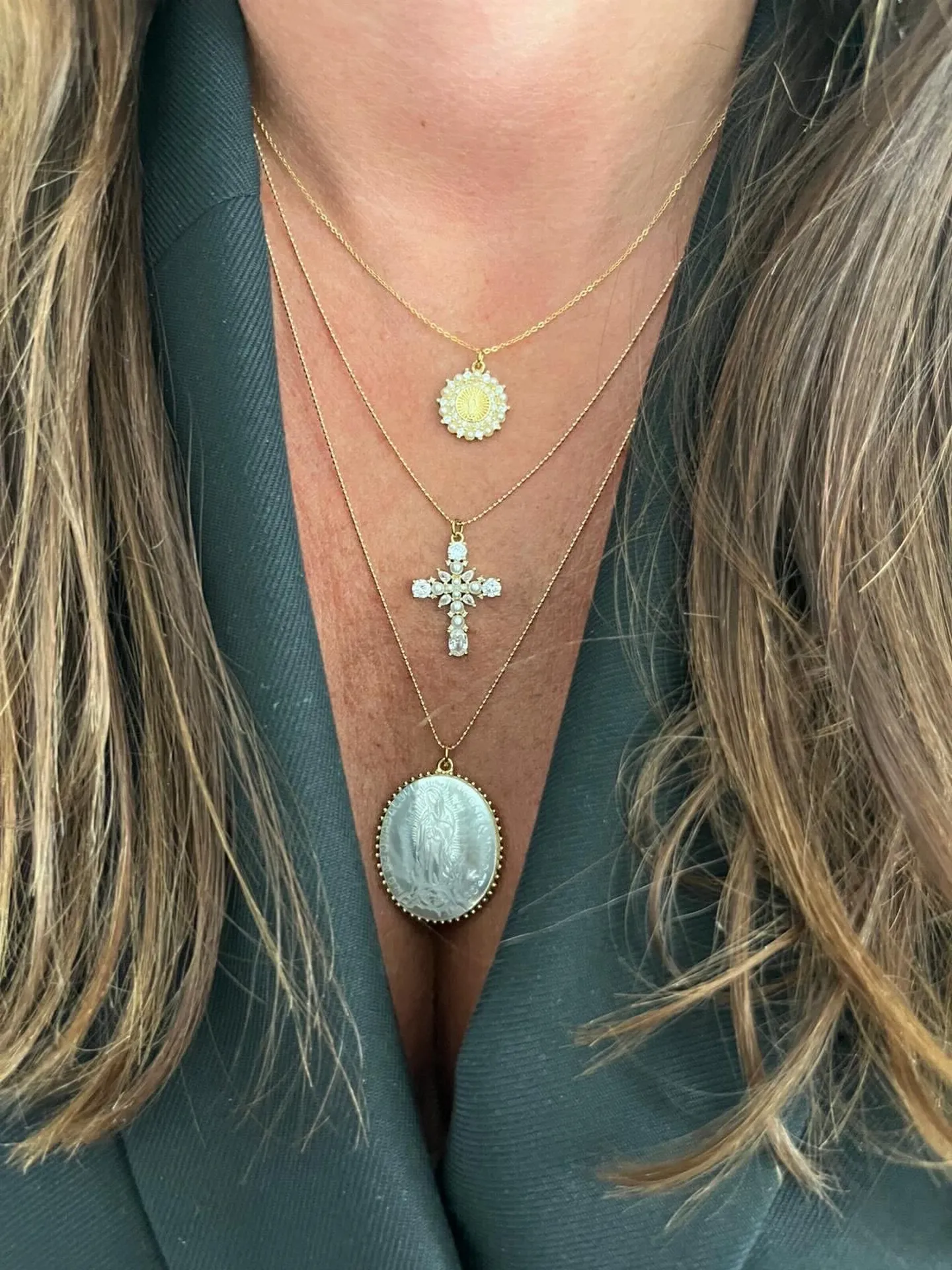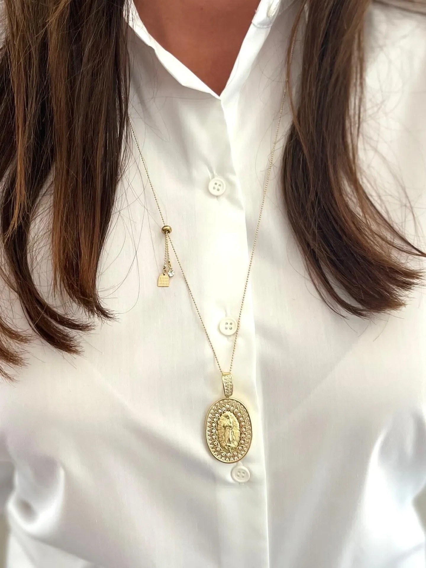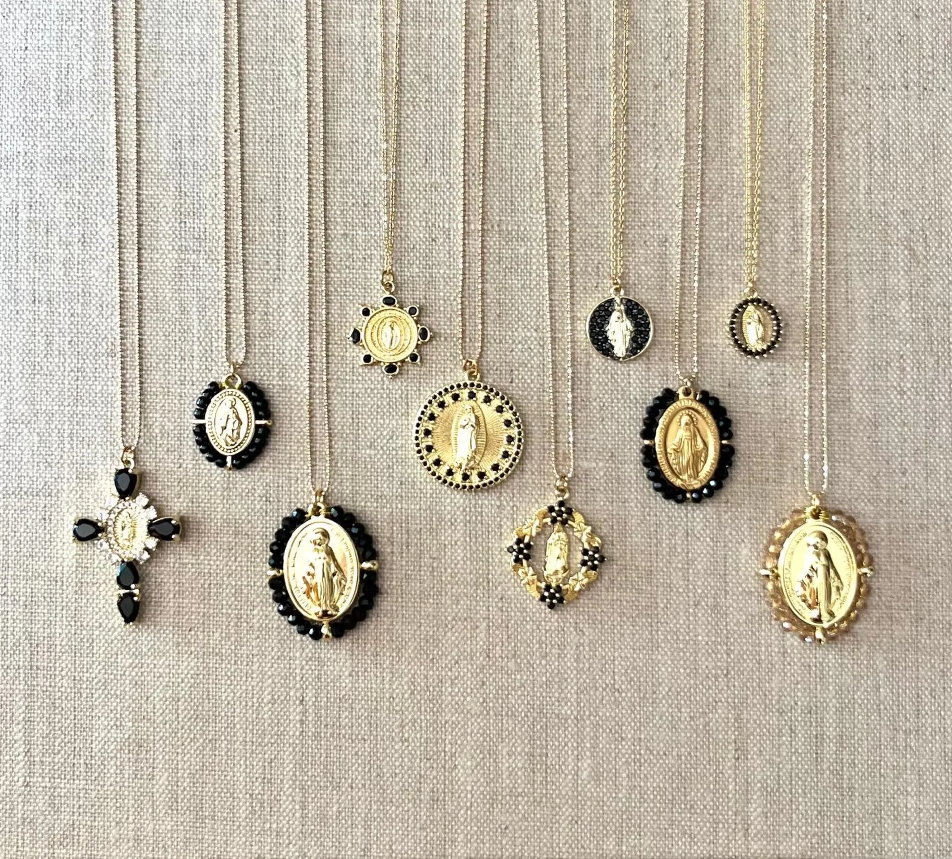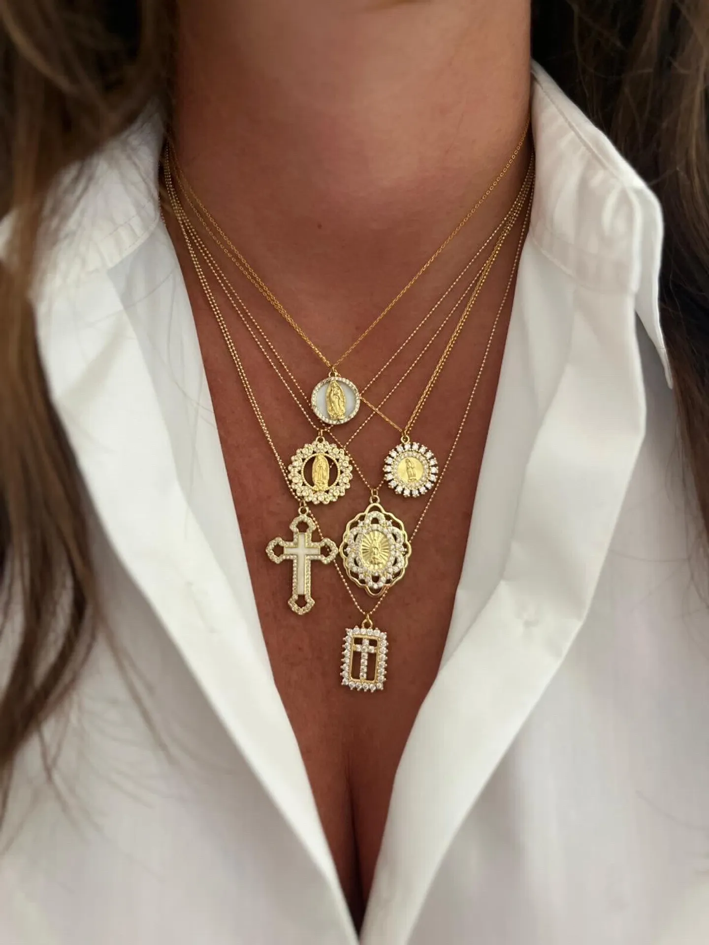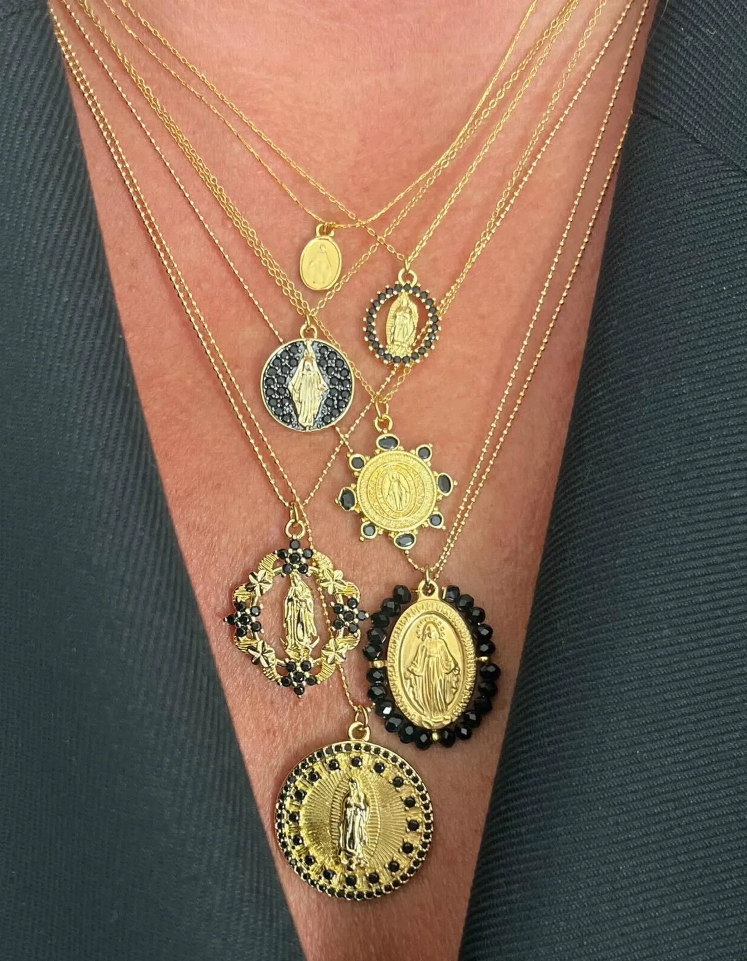 Les colliers Madones se déclinent en plusieurs modèles : dorés à l’or fin, sertis de pierres noires, ornés de perles nacrées ou sculptés dans une superbe nacre naturelle. Leur éclat sublime toutes les tenues, du look décontracté au style plus habillé. On les porte seules pour une touche élégante, ou en accumulation de colliers, pour un effet moderne et lumineux.
