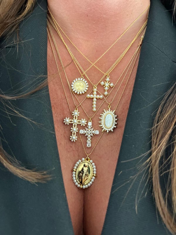 Les colliers Madones se déclinent en plusieurs modèles : dorés à l’or fin, sertis de pierres noires, ornés de perles nacrées ou sculptés dans une superbe nacre naturelle. Leur éclat sublime toutes les tenues, du look décontracté au style plus habillé. On les porte seules pour une touche élégante, ou en accumulation de colliers, pour un effet moderne et lumineux.