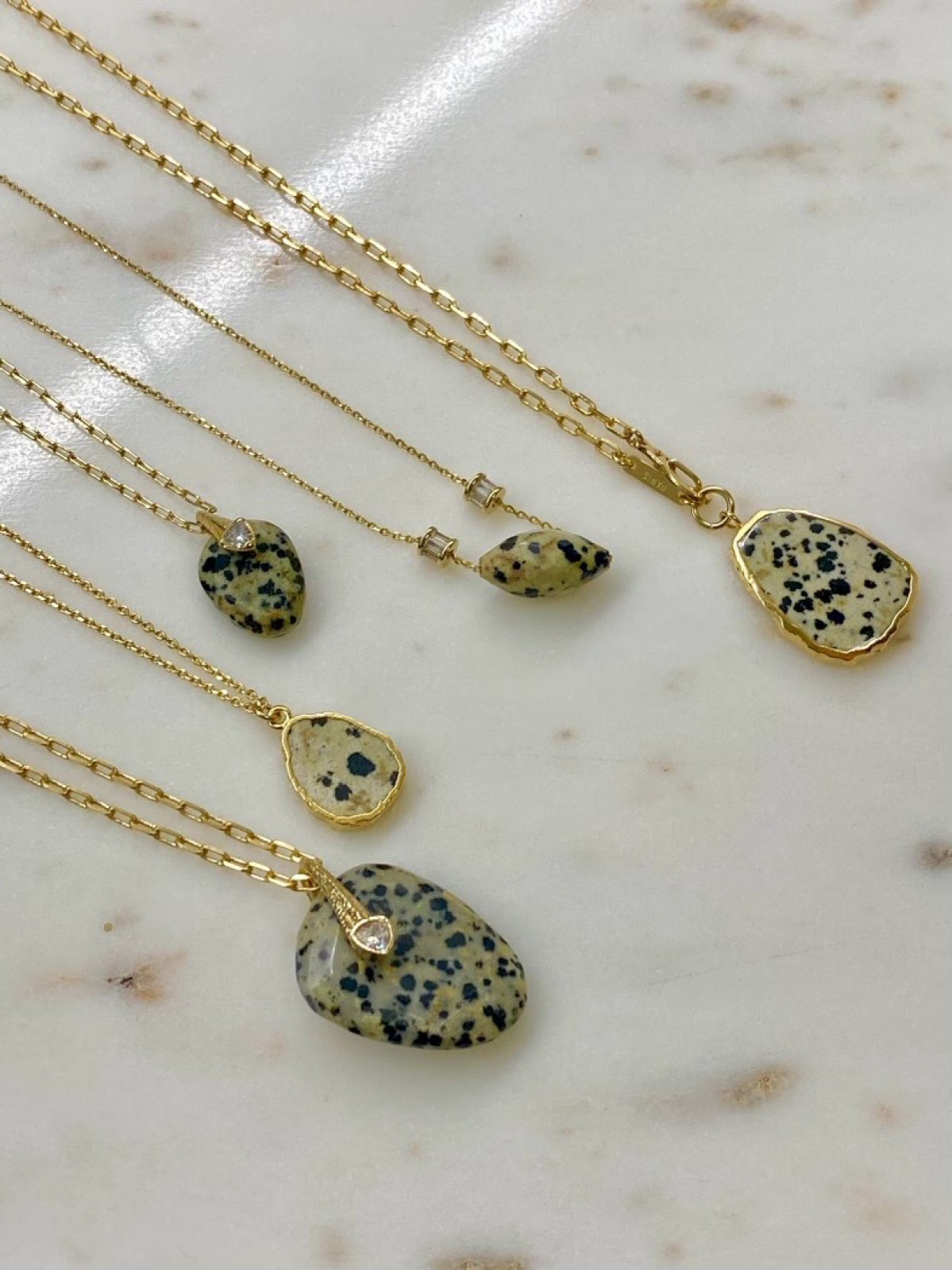 Les bijoux Hanka In avec jaspe dalmatien s’intègrent parfaitement à différents looks :