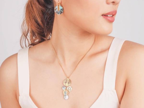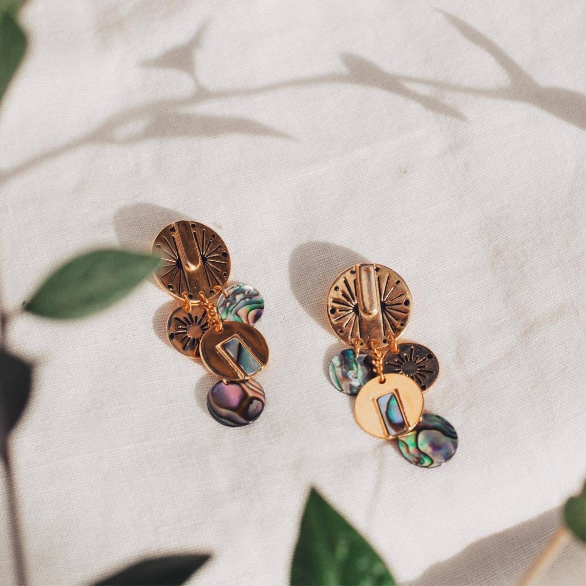 Découvrez la collection Danna avec de la nacre d’abalone. Toutes les pièces sont gravées et émaillées afin de faire ressortir les motifs solaires de cette ligne de bijoux