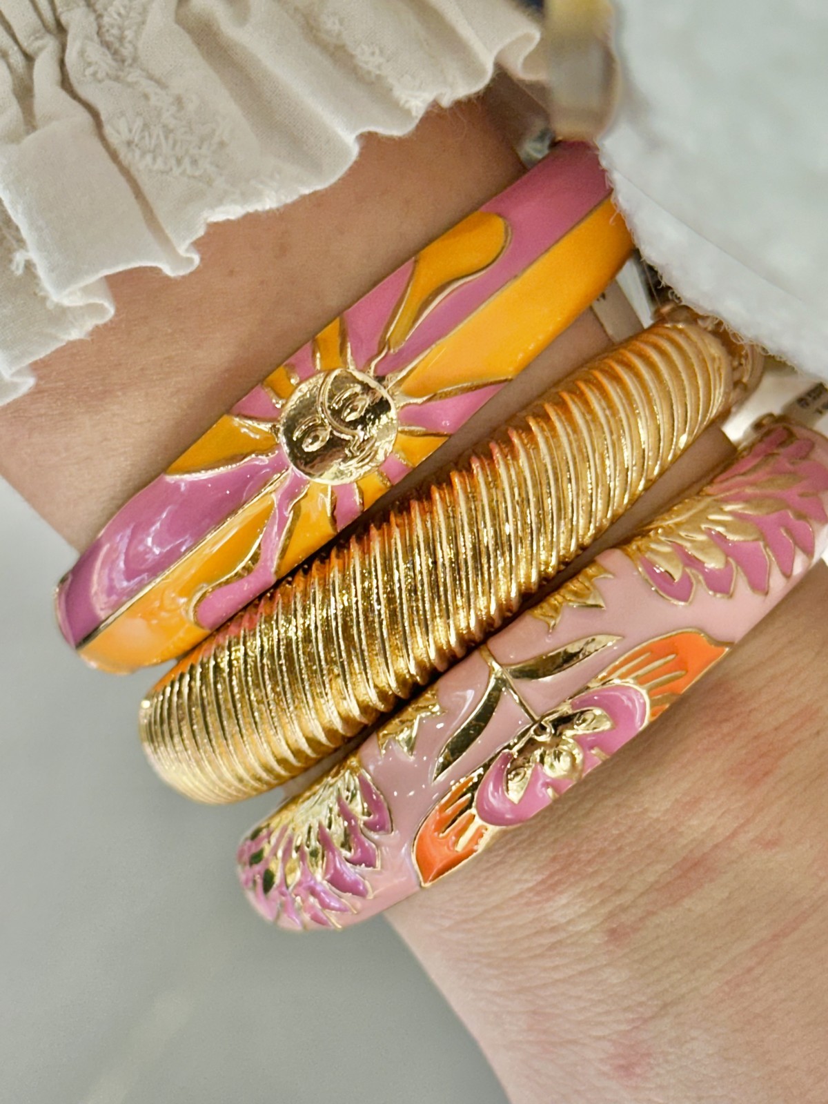 Les joncs Amok, véritables icônes de la marque, se réinventent cette saison dans des teintes éclatantes et des motifs vibrants, parfaits pour accessoiriser vos tenues estivales. Fabriqués en France, plaqués or et émaillés à la main, ils allient le raffinement de l’artisanat à un style résolument contemporain.