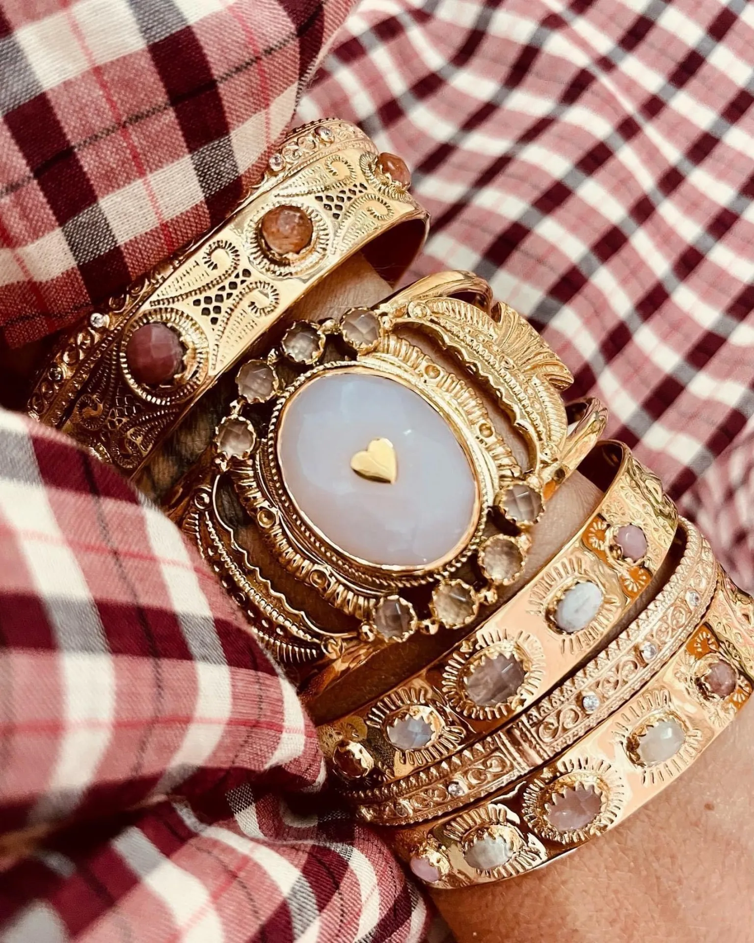 Créé il y a 4 ans, ce modèle fait partie des premiers bijoux imaginés par L'Atelier Plume. Sa manchette ajourée, élégante et intemporelle, se distingue par ses nombreux détails raffinés et sa pierre centrale finement ciselée.