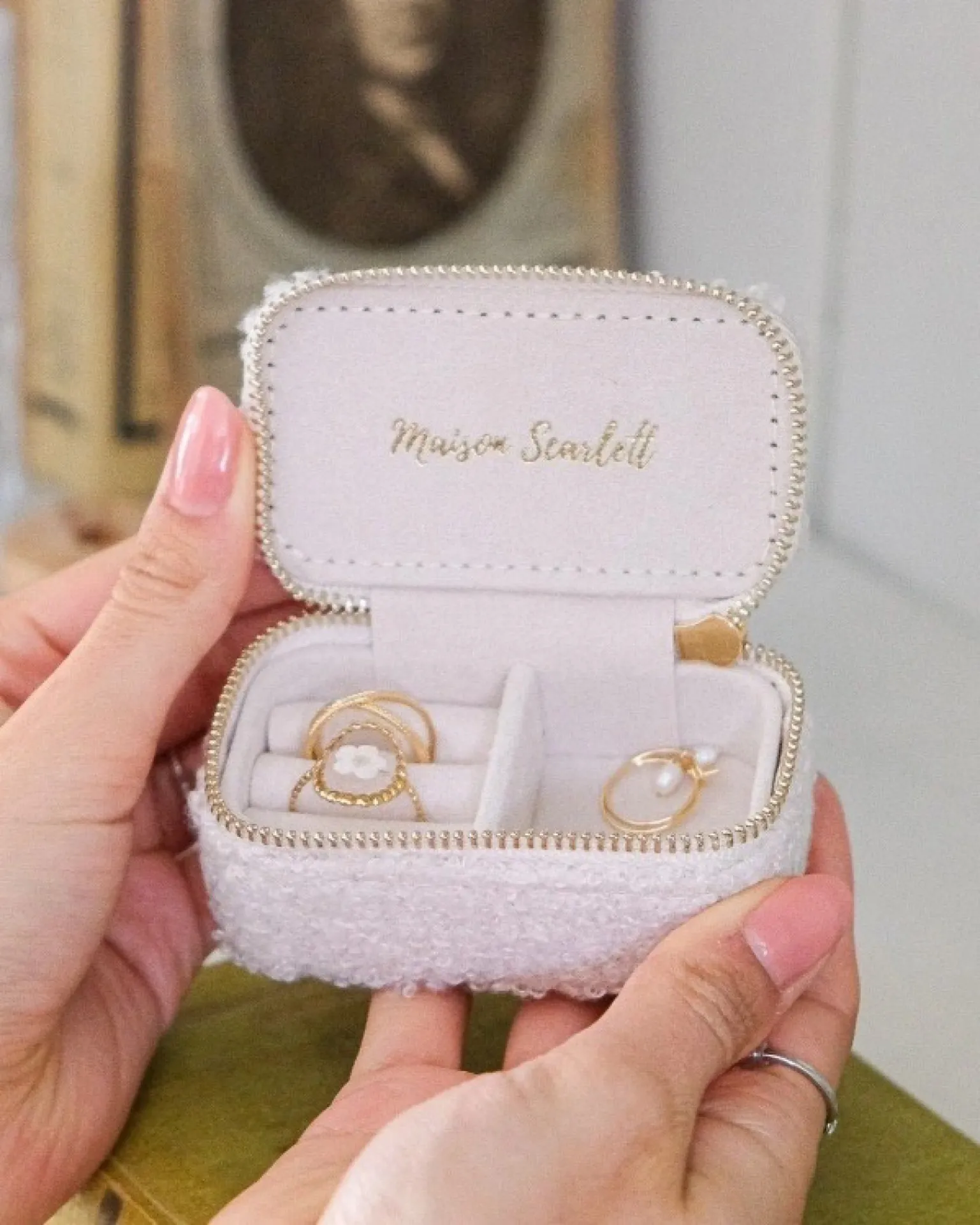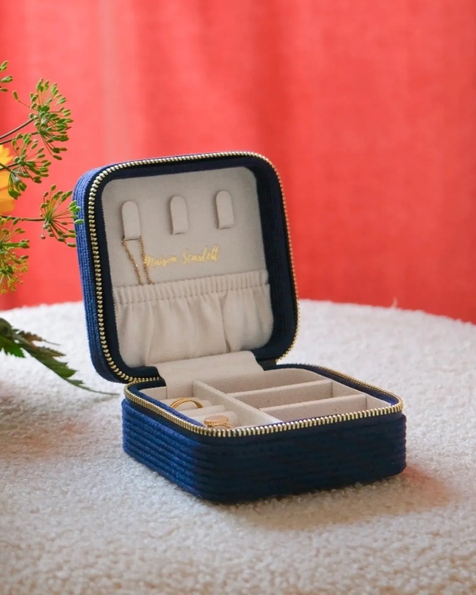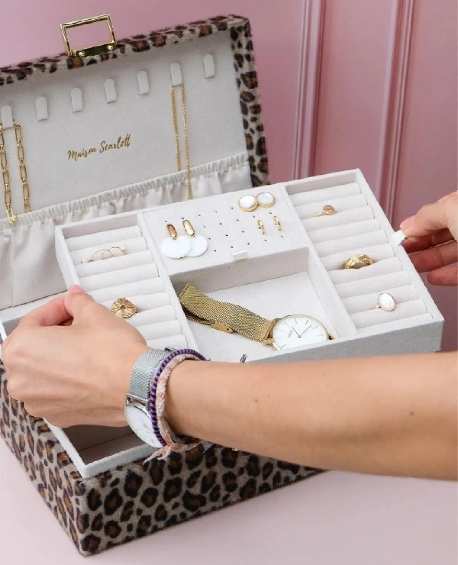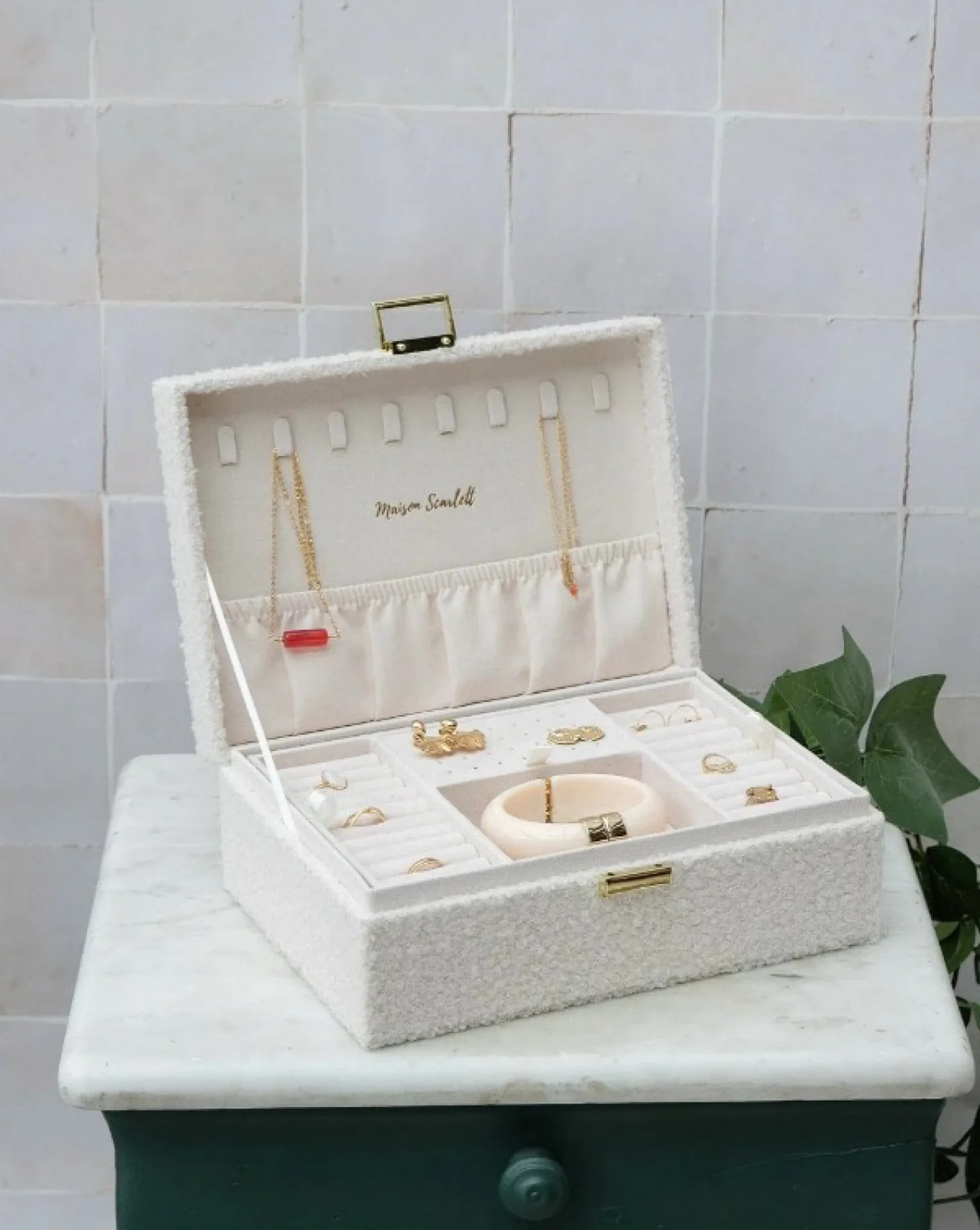 MAISON SCARLETT propose plusieurs tailles de boîtes à bijoux, de la mini version de voyage à la grande boîte compartimentée idéale pour la maison.