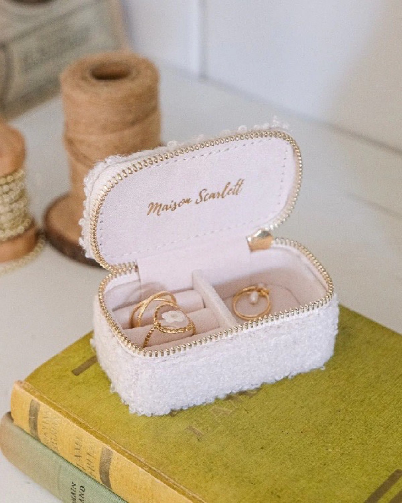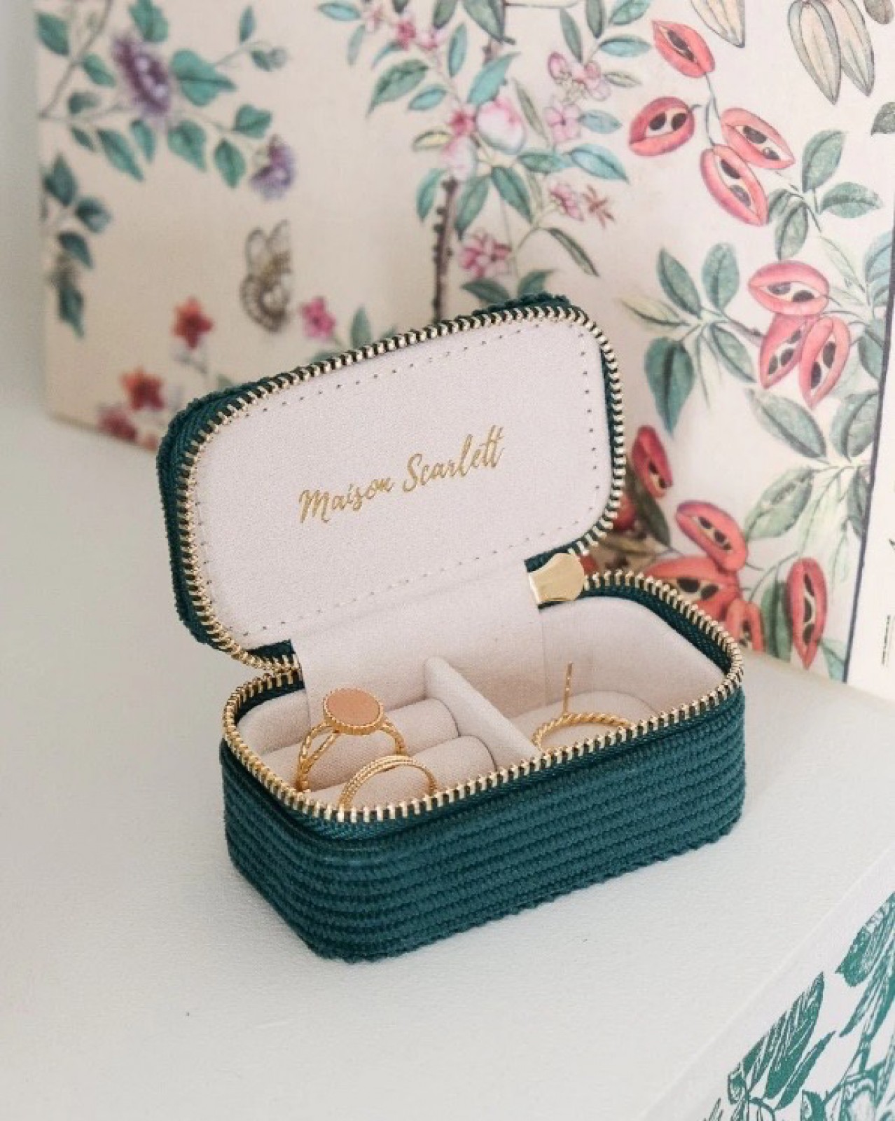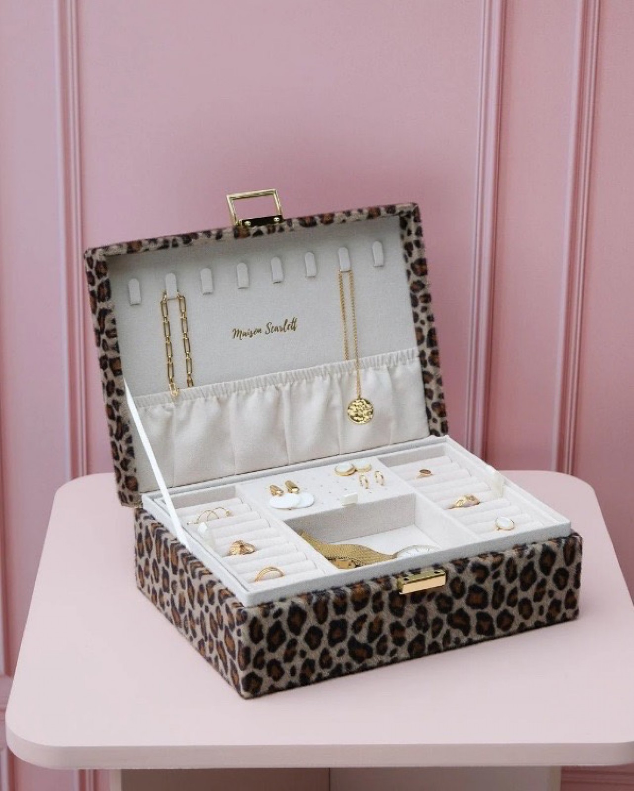 MAISON SCARLETT propose plusieurs tailles de boîtes à bijoux, de la mini version de voyage à la grande boîte compartimentée idéale pour la maison.