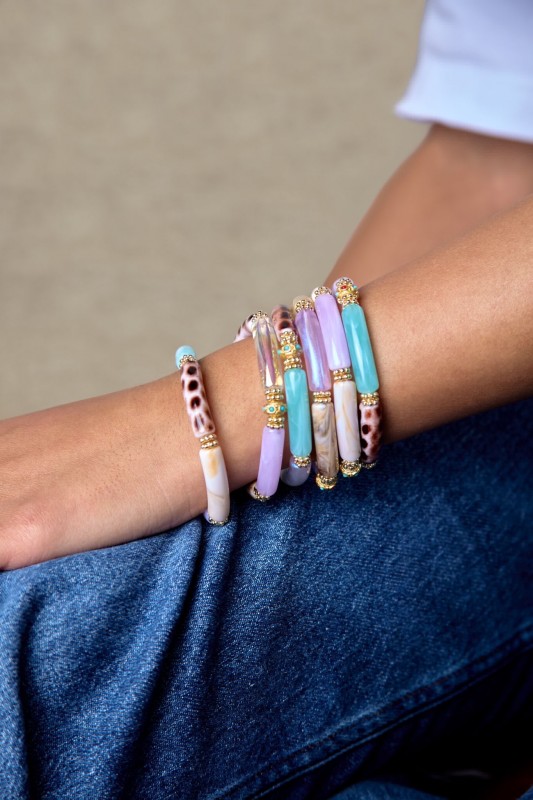 Les bracelets JUHU sont élaborés avec des perles acrylique, agrémentés d'empiècements dorés et d'un donuts coloré, montés sur un fil élastique résistant. Ils sont fabriqués à la main avec soin et dans une variété de couleurs pour s’accorder à chaque tenue. Le bracelet JUHU se porte aussi bien seul, pour une touche subtile et élégante, qu’en accumulation pour un effet plus audacieux.