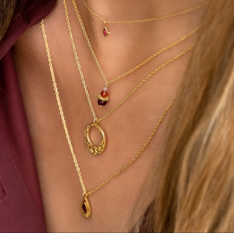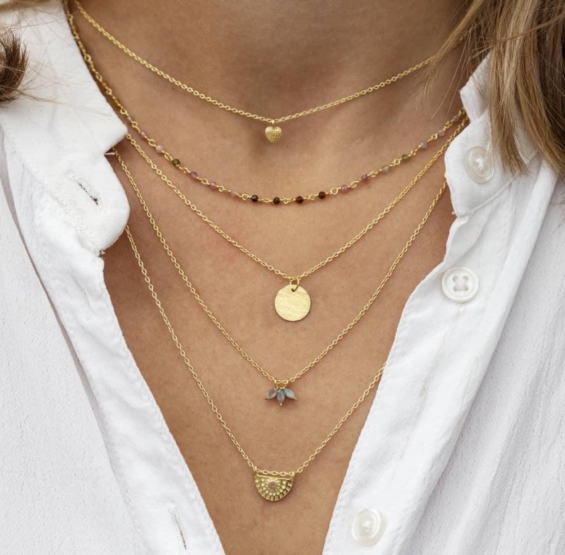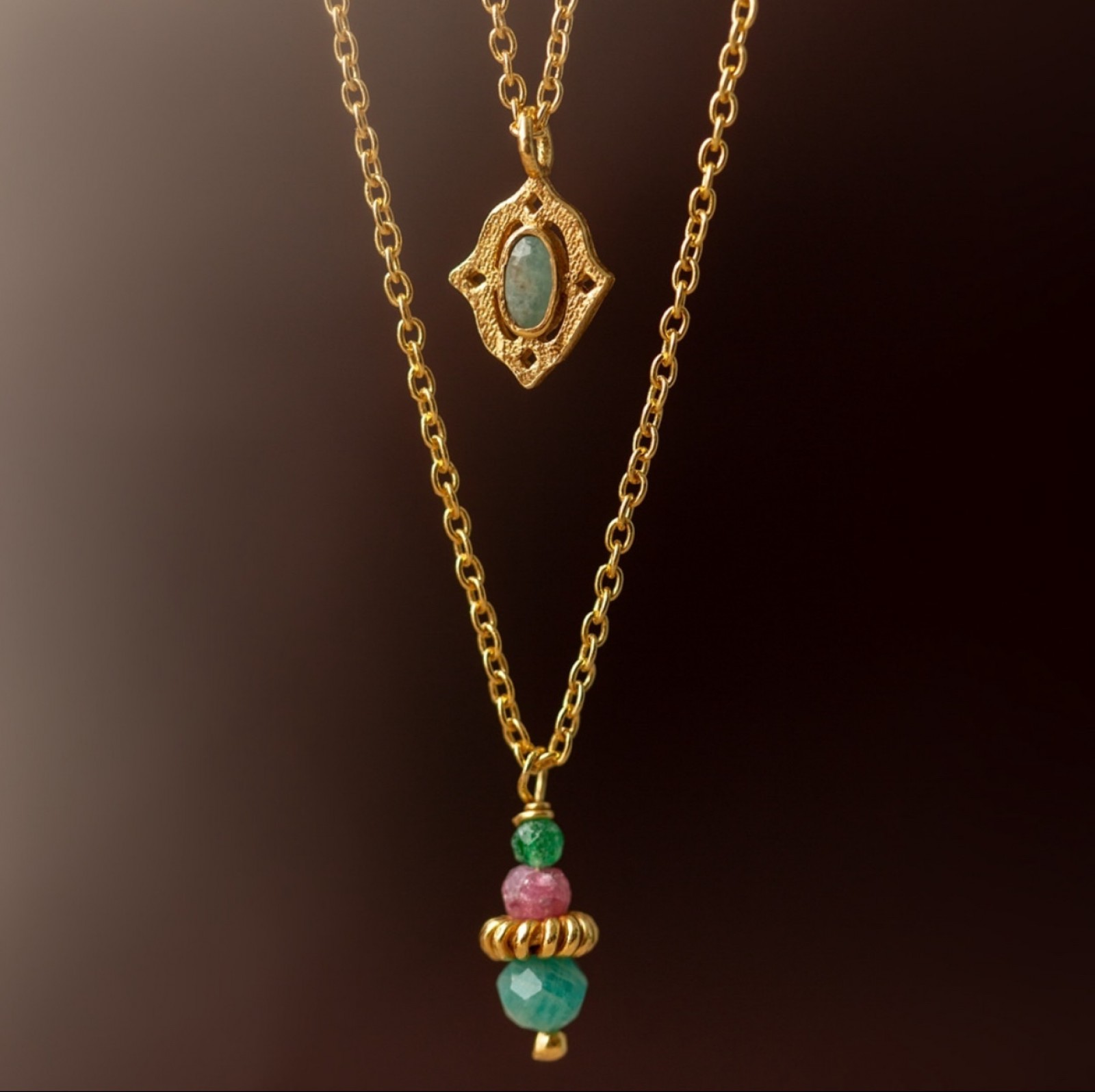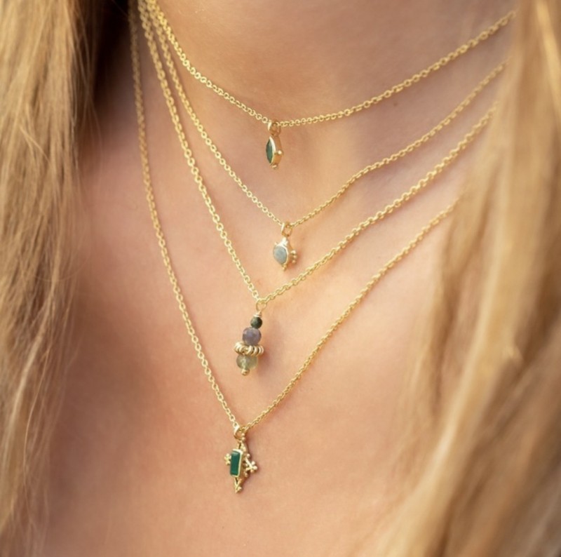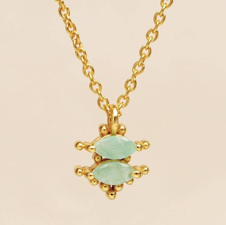 Les colliers Muja Juma sont fins, délicats et se prêtent naturellement à l’accumulation ou stacking. Les pendentifs sont petits et ornés de pierres naturelles. Ils se déclinent exactement avec les boucles d’oreilles pendantes ou puces d’oreilles avec les pierres identiques.
